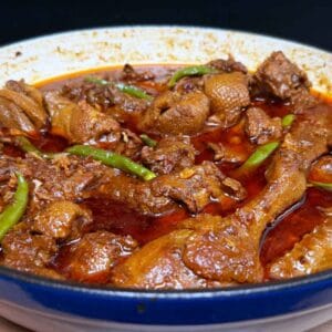 - Simmer on Low Heat: Reduce the heat to low and add 2–3 slit green chilies. Cover the pan and let the duck simmer for at least 30 minutes. Stir occasionally, being gentle to avoid breaking the meat. Add splashes of water as needed to maintain a saucy consistency.